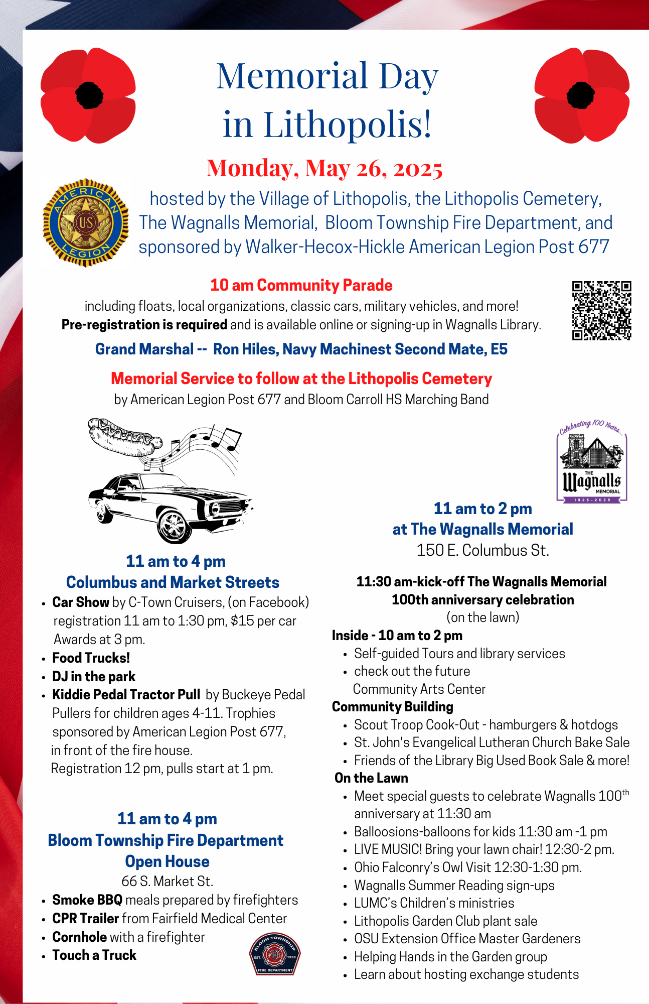 Monday, May 26, 2025 from 10 am – 2 pm. Visit Lithopolis on Monday, May 27 for a Memorial Day celebration with events including a cruise-in, 100th anniversary celebration at the Wagnalls Memorial Library, Bloom Township Fire Dept Open House, live music, vendors, tours, food, and more!